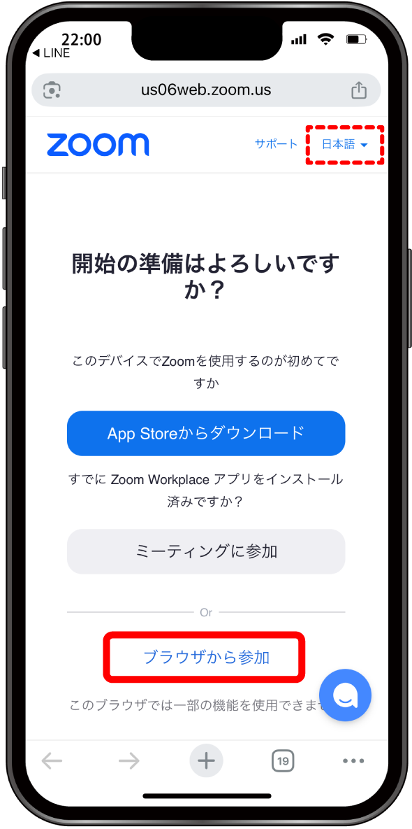 Zoomの画面が表示されましたら「ブラウザから参加」をタップしてください。
