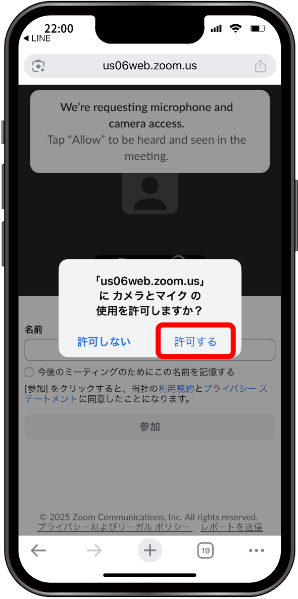 カメラとマイクの使用の可否選択が表示されますので、「許可する」をタップしてください。